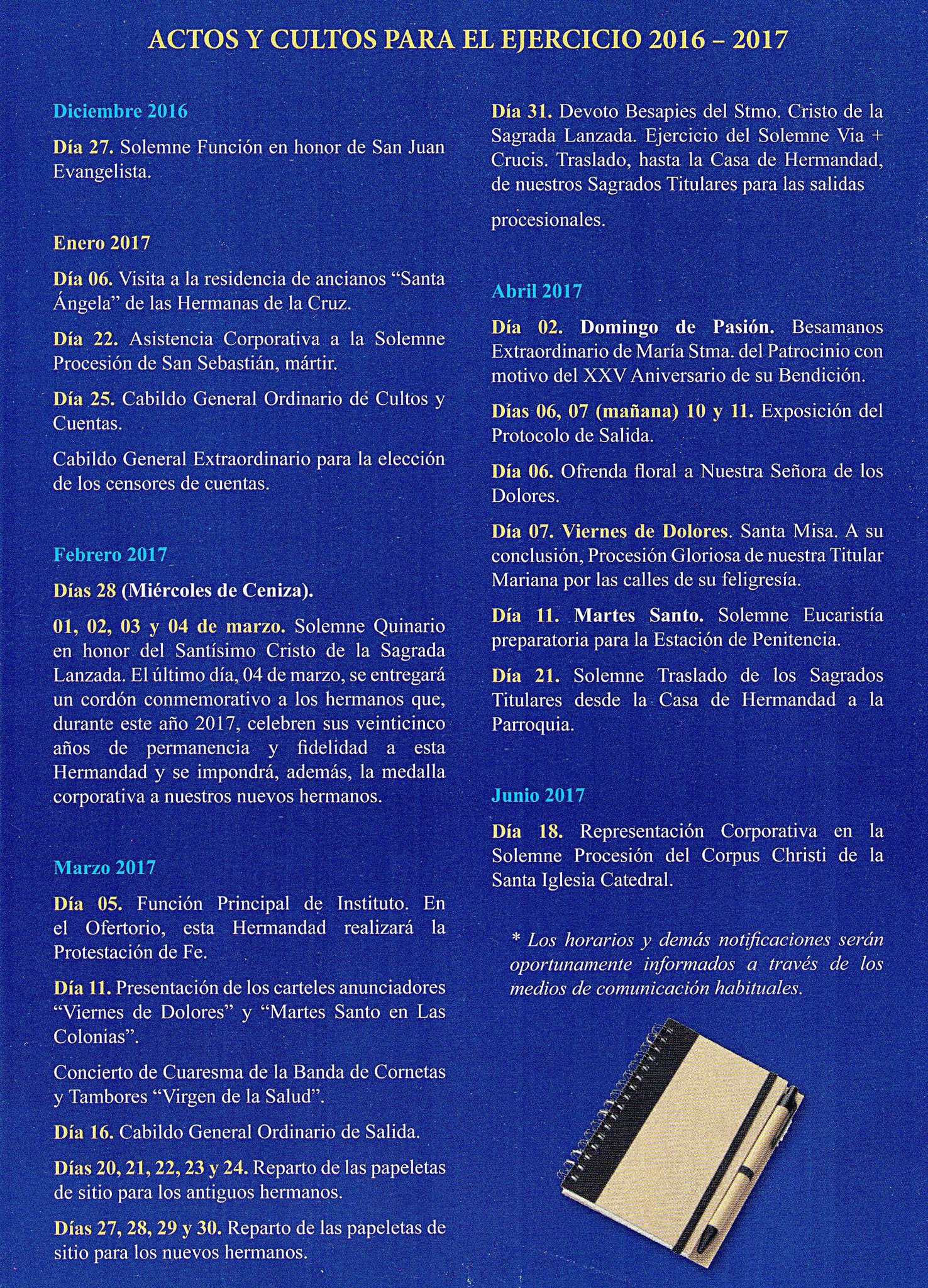 En la noche de ayer, 30 de enero de 2017, reunida en Asamblea General Ordinaria y Extraordinaria de nuestra hermandad, ha decidido entre otras cosas igualmente importantes el cambio del hábito nazareno a partir de la Semana Santa 2017. El nuevo hábito elimina el tejido de raso (capa, fajín y botonadura) pasando a ser de sarga. Además se sustituye el color de la capa pasando a ser también blanca al igual que la túnica y el morrión.
